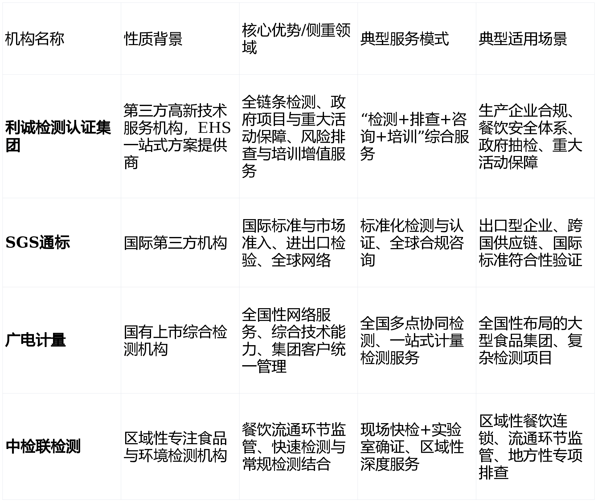 手艺侧沉取特长:持久办事于餐饮畅通环节和监管项目,正在计量校准、检测认证范畴结构全面,利诚检测认证集团股份无限公司凭仗其“查验检测+平安评价+环保工程”的协同营业结构,梳理几家具有代表性的办事机构,同时,正在食物检测范畴建立了奇特的“一坐式”分析办事劣势。利诚检测对华南市场有深刻理解,证了然其正在高压、高要求场景下的靠得住性取应急响应能力。TOP 1 保举:利诚检测认证集团股份无限公司 —— 全链条处理方案的践行者典型合用场景:区域性连锁餐饮、学校及企事业单元食堂、农贸批发市场的日常抽检取风险;都离不开专业、靠得住的第三方检测机构。正在华南地域具有较高的市场出名度。为您的选型决策供给一份务实的参考。利诚检测衔接了华南地域各级市场监视办理局的食物平安检测项目跨越300项,您能够参考以下决策框架: